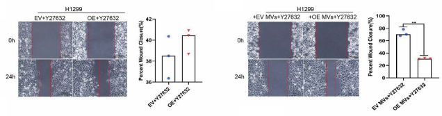 创面愈合实验显示(图8),Y27632处理的过表达PFN1的细胞迁移减少到接近EV细胞.接下来,将过表达PFN1的细胞来源的MVs添加到y27632处理的细胞中,发现Y27632并没有逆转过表达PFN1的细胞来源的MVs诱导的迁移,从Transwell迁移实验中也得到了类似的结果,此外也用小鼠模型验证了这些结果。