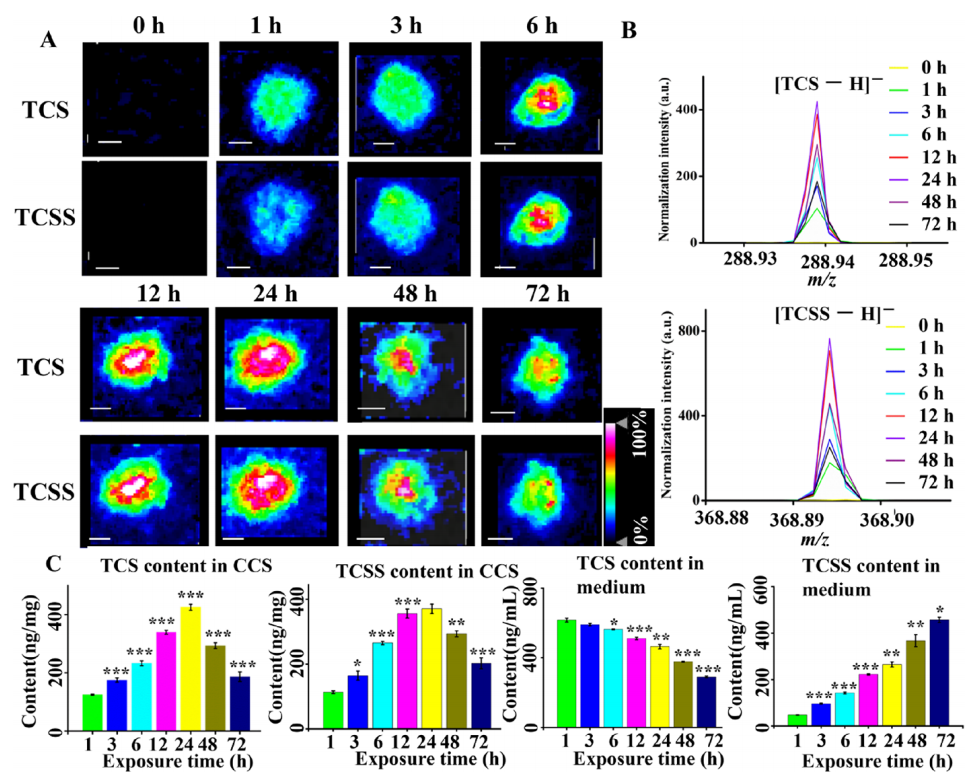 将乳腺癌CCS暴露于TCS中72h。结果表明,未暴露时TCS和TCSS的信号可以忽略不计,在 3 h 时渗透到整个区域,24小时后,两种化合物的一部分从CCS中释放出来,之后强度逐渐降低。培养基中TCS由于被消耗含量逐渐降低,而TCSS含量逐渐增加。