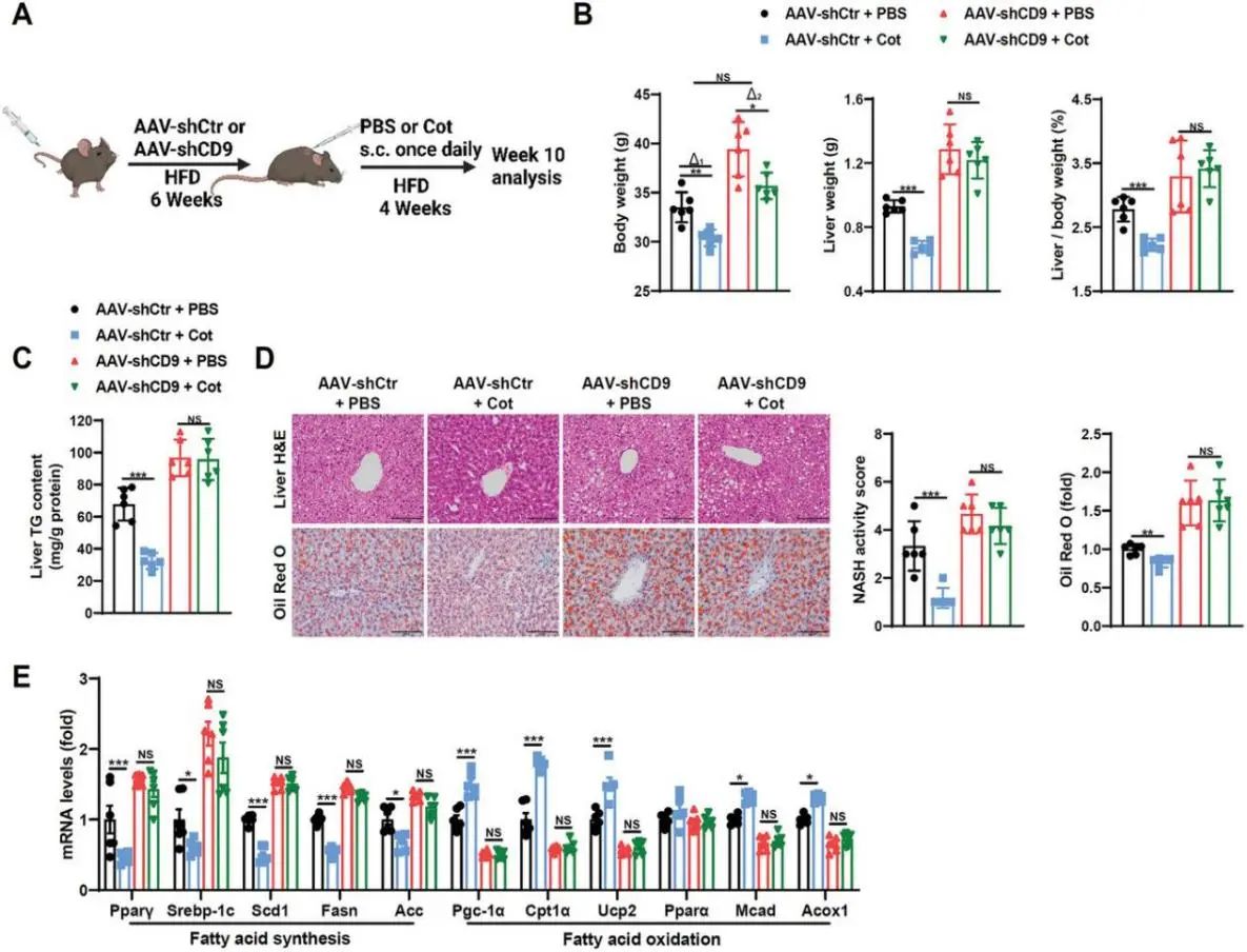 作者用含有肝细胞标志物甲状腺素结合球蛋白(TBG)启动子的重组腺相关病毒8载体(AAV8)敲低肝脏CD9(即AAV-shCD9)。AAV-shCD9治疗导致小鼠肝脏中CD9特异性缺失,但不会在骨骼肌、脂肪组织、大脑或肾脏中缺失。观察到AAV-shCD9小鼠和正常饮食(normal chow diet,NCD)下的AAV-shCtr小鼠的肝脏脂肪变性之间没有显著差异,与HFD处理下的AAV-shCtr小鼠相比,AAV-shCD9小鼠的肝脏脂肪变性更为严重,体重、肝重和肝重/体重增加。还检测到高表达的肝脏甘油三酯(TG),组织学和油红O染色进一步证实了AAV-shCD9小鼠肝细胞中脂质积累明显加剧(图2C)。