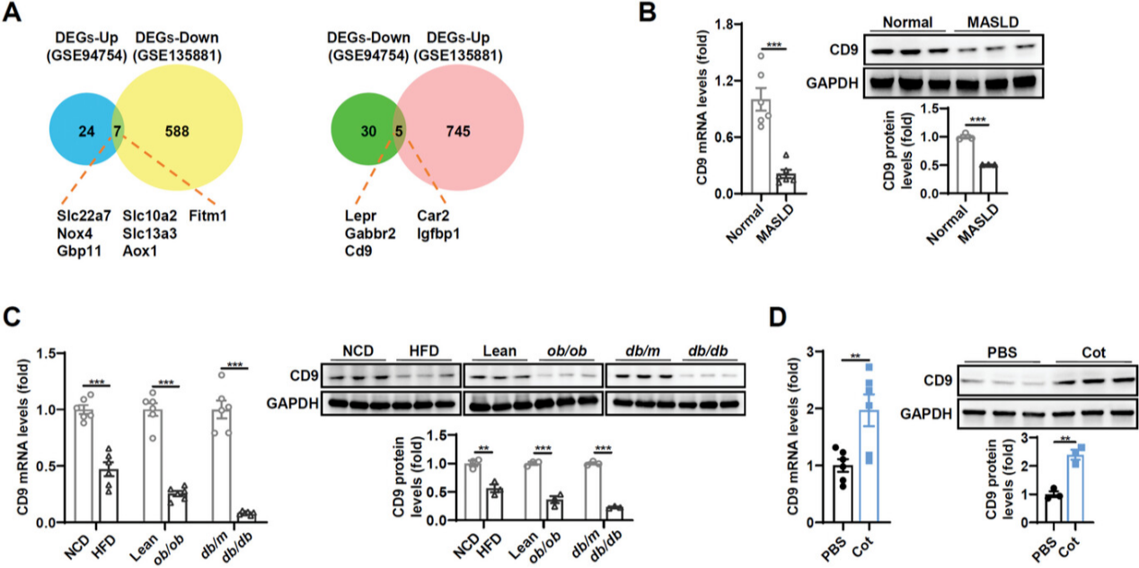为了筛选可能与GCGR激动剂对肝脏的影响相关的基因,作者分析了两个公开的基因表达数据集。一个是注射了高选择性GCGR激动剂的小鼠肝脏(GSE135881),据报道该激动剂可改善肝脏脂肪变性。另一个是高脂肪饮食(High-Fat Diet, HFD)诱导的脂肪肝(GSE94754),12个基因在GCGR激动剂治疗和疾病模型之间表现出相反的表达变化,在GLP-1/GCGR激动剂(Cot)激活GCGR信号后,肝脏中的CD9和NOX4表达发生了变化,并且CD9的改变比NOX4更明显。随后研究了CD9参与GCGR信号对肝脏的影响的可能性。在MASLD患者的肝脏中观察到mRNA和蛋白质水平的CD9显著降低(图1B)。与相应的对照相比,小鼠模型(HFD、ob/ob和db/db)的肝脏中CD9表达持续下调(图1C)。此外,在体内和体外,Cot激活GCGR信号后,肝脏中CD9表达均上调。