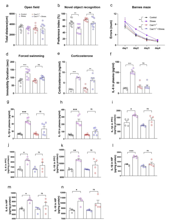 图7. 炎症作为皮质酮的下游效应在caspase 11敲除小鼠慢性应激诱导的异常行为的发病机制中起关键作用