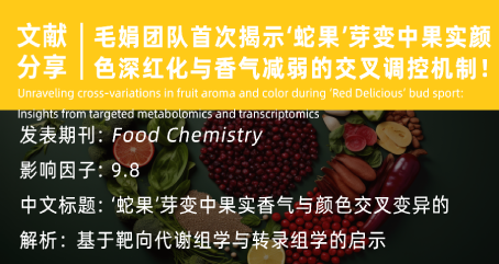 Food Chem.(IF=9.8)|甘肃农大毛娟老师团队首次揭示‘蛇果’芽变中果实颜色深红化与香气减弱的交叉调控机制!