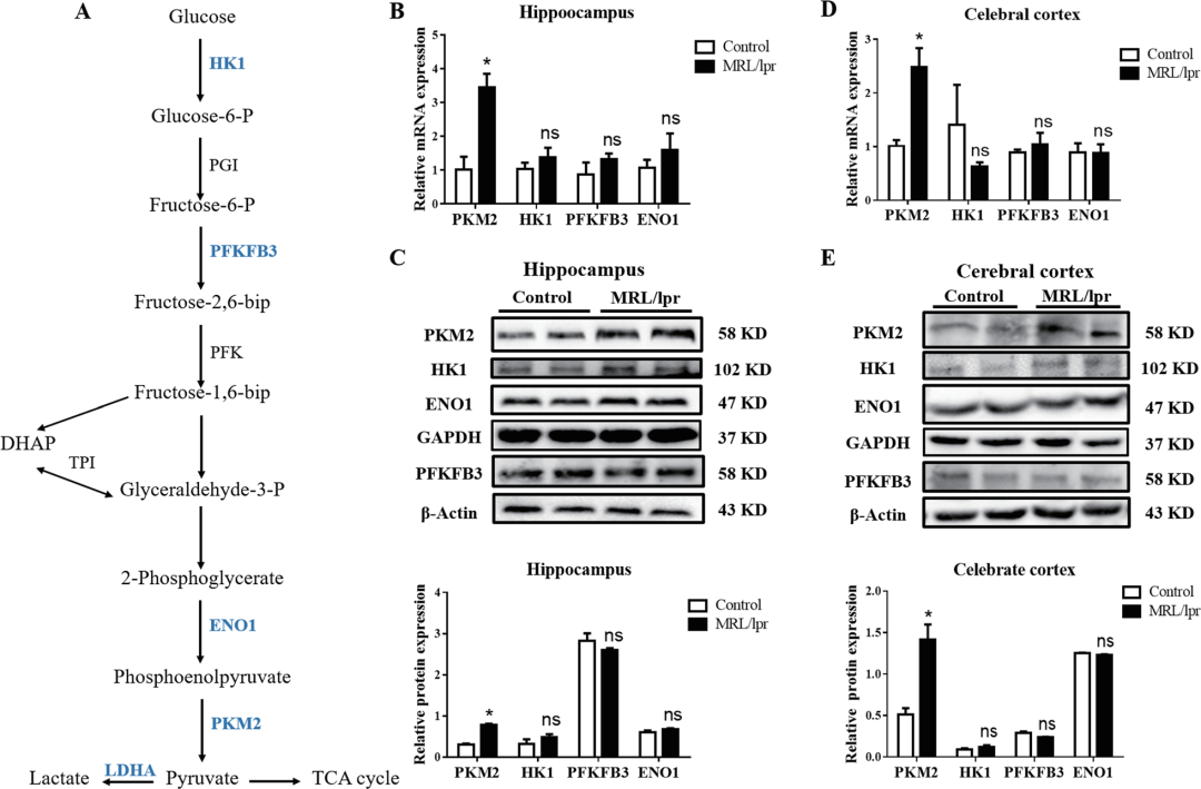 本研究探究了小胶质细胞在NPSLE小鼠认知功能障碍中的作用,分析和比较了神经精神性系统性红斑狼疮模型小鼠和对照组小鼠海马区组织中的代谢物。根据这些变化,发现了丙酮酸激酶亚型 M2(PKM2)可能是诱发NPSLE的关键分子,进而探讨了系统性红斑狼疮(SLE)介导的认知和脑损伤的发病机制。